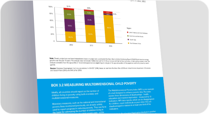 Children and poverty: Breaking the vicious cycle >> Children living in extreme poverty FIGURE 3.2 In 2030, 9 out of 10 children in extreme poverty will live in sub-Saharan Africa estimated percentage of children living in extreme poverty (US$1.90 a day), by World Bank region, in 2002, 2012 and projections for 2030 5.1% 3.9% 100% 6.5% 10.9% 4.5% 0.7% 80% 27.3% 32.4% 60% 37.5% 88.3% Region: 40% latin america and the Caribbean 52.9% east asia and the Pacific 20% 30.2% South asia 0 Sub-Saharan africa 2002 2012 2030 Note: Poverty projections are linear interpolations based on projections published in the World Bank’s Global Monitoring Report 2015/2016 and assume average growth over the past 10 years. The analysis does not include Middle east and north africa, europe and Central asia due to lack of data and low poverty rates. The analysis considers how the age profile of the extreme poor evolves depending on changes in the age composition of the population and fertility rates by wealth quintile. Source: overseas development institute calculations for UniCef (2016), based on data from the World Bank (2016) and United nations department of economic and Social affairs (2013) and dhS (after 2005). BOx 3.2 MEASURING MULTIDIMENSIONAL CHILD POvERTY Ideally, all countries should report on the number of The Multidimensional Poverty Index (MPI) is one example children living in poverty using both monetary and of a tool designed to enhance poverty data. The index multidimensional measures. covers three dimensions of disadvantage – health, education and material deprivation – measured by 10 Monetary measures, such as the national and international indicators. MPI data reports, which can be disaggregated poverty lines mentioned previously, are already widely for children, count individuals as poor when they are used to report progress in reducing poverty. They can form disadvantaged in relation to at least one third of the the basis for estimating the number of children living in indicators. monetary poverty – that is, the child poverty rate – at the national, regional and global levels. The Multiple overlapping Deprivation Analysis is another tool, developed by UNICEF, to sharpen the equity focus of Multidimensional child poverty measures add depth and child poverty and deprivation analyses around the world. complexity to the data. They can be adapted and applied t It selects the child as the unit of analysis, rather than the o each country’s economic and social context, informing the household, since children experience poverty differently development of national approaches to poverty reduction. than adults. The STaTe of The World’S Children 2016 74