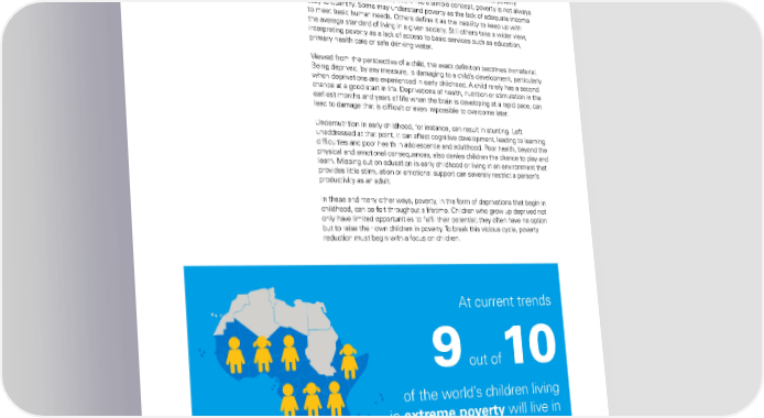 Children and poverty: Breaking the vicious cycle >> The effects of poverty in childhood The effects of poverty in childhood There is no universal interpretation of poverty in general, or of child poverty more specifically. While it may seem like a simple concept, poverty is not always easy to quantify. Some may understand poverty as the lack of adequate income to meet basic human needs. others define it as the inability to keep up with the average standard of living in a given society. Still others take a wider view, interpreting poverty as a lack of access to basic services such as education, primary health care or safe drinking water. Viewed from the perspective of a child, the exact definition becomes immaterial. Being deprived, by any measure, is damaging to a child’s development, particularly when deprivations are experienced in early childhood. a child rarely has a second chance at a good start in life. deprivations of health, nutrition or stimulation in the earliest months and years of life when the brain is developing at a rapid pace, can lead to damage that is difficult or even impossible to overcome later. Undernutrition in early childhood, for instance, can result in stunting. left unaddressed at that point, it can affect cognitive development, leading to learning difficulties and poor health in adolescence and adulthood. Poor health, beyond the physical and emotional consequences, also denies children the chance to play and learn. Missing out on education in early childhood or living in an environment that provides little stimulation or emotional support can severely restrict a person’s productivity as an adult. in these and many other ways, poverty, in the form of deprivations that begin in childhood, can be felt throughout a lifetime. Children who grow up deprived not only have limited opportunities to fulfil their potential; they often have no option but to raise their own children in poverty. To break this vicious cycle, poverty reduction must begin with a focus on children. At current trends 9out of 10 of the world’s children living in extreme poverty will live in sub-Saharan Africa in 2030 The STaTe of The World’S Children 2016 70