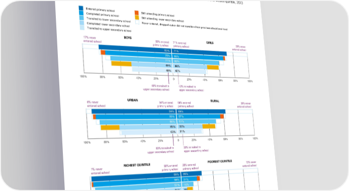 Education: Levelling the playing field >> Equity and learning outcomes FIGURE 2.5 Wealth, gender and residence affect education in Nigeria FIGURE 2.5 educational attainment of upper-secondary-school-aged adolescents by sex, residence and wealth quintile, 2013 Wealth, gender and residence affect education in Nigeria Educational attainment of upper-secondary-school-aged adolescents in Nigeria, 2013 Entered primary school Still attending primary school Completed primary school Still attending lower secondary school Transited to lower secondary school Never entered, dropped out or did not transition from previous educational level Completed lower secondary school Transited to upper secondary school 17% never BOYS 83% entered 71% entered GIRLS 29% never entered school primary school primary school entered school 83% 71% 76% 66% 71% 60% 49% 44% 48% 42% 100% 80% 60% 40% 20% 0 20% 40% 60% 80% 100% 48% transited to 42% transited to upper secondary school upper secondary school 6% never URBAN 94% entered 64% entered RURAL 36% never entered school primary school primary school entered school 94% 64% 90% 57% 51% 86% 33% 65% 31% 63% 100% 80% 60% 40% 20% 0 20% 40% 60% 80% 100% 63% transited to 33% transited to upper secondary school upper secondary school 1% never RICHEST QUINTILE 99% entered 28% entered POOREST QUINTILE 72% never entered school primary school primary school entered school 99% 28% 98% 21% 97% 16% 81% 8% 80% 7% 100% 80% 60% 40% 20% 0 20% 40% 60% 80% 100% 80% transited to 7% transited to upper secondary school upper secondary school Note: Due to rounding, some totals may not correspond with the sum of the separate figures. Source: UNICEF analysis based on Nigeria DHS, 2013. The STaTe of The World’S Children 2016 48 65