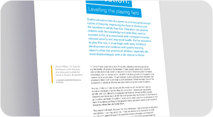 ChaPTer 2 Education: levelling the playing field quality education has the power to end intergenerational cycles of inequity, improving the lives of children and the societies in which they live. Education can provide children with the knowledge and skills they need to succeed in life. It is associated with increased incomes, reduced poverty and improved health. But for education to play this role, it must begin with early childhood development and continue with quality learning opportunities that provide all children, especially the most disadvantaged, with a fair chance to thrive. Jhuma Akhter, 14, does her in rich and poor countries around the globe, education has long served as homework under the glow a great leveller of opportunity because it helps people realize their potential of a lamp post outside her and contribute to their communities and the world. Good education increases home in Khulna, Bangladesh. knowledge, sparks innovation, builds skills that drive growth and prosperity, and fosters inclusive societies. for generations, quality and equitable education has © UNICEF/UN016303/Gilbertson provided children with a pathway out of deprivation. What has been true for the vII Photo prospects of individual children has also held true for the future of nations. and yet, millions of children around the world are still denied their right to education because of factors they do not control – factors such as poverty, gender, ethnicity, disability or geographical location. armed conflict, natural disasters and the impacts of climate change also deprive children of the chance to go to school and learn. in addition, when public resources are not allocated on the basis of evidence pointing to the greatest need, education systems can entrench inequities rather than dismantle them. This chapter will make the case that two challenges – lack of access to education and deficits in learning outcomes – must be overcome for education to fulfil its role as an agent of equity. To overcome these challenges, countries will be best served if they offer comprehensive early childhood care and learning opportunities, and if they focus on making the fastest progress for the children left furthest behind. This approach has the potential to narrow the gaps in educational outcomes between the richest and poorest children by 2030. The STaTe of The World’S Children 2016 41