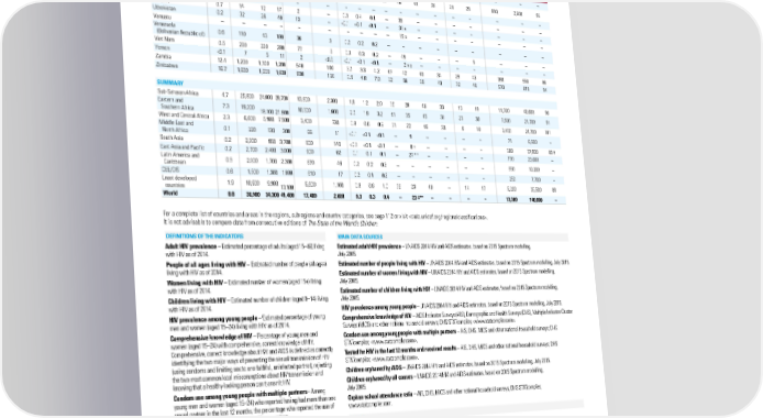 TABLE 4. HIV/AIDS Mother-to- child Paediatric transmission infections Prevention among young people (aged 15–24) HIV testing Orphans Women Children Condom use Young people who Children Children Adult HIV People of all ages living with living HIV prevalence Comprehensive among were tested for HIV orphaned orphaned due Orphan preva- living with HIV HIV with HIV among knowledge of young people with in the last 12 months by AIDS to all causes school lence (%) (thousands) (thousands) (thousands) young people (%) HIV (%) multiple partners and received results (thousands) (thousands) attendance Countries 2014 2014 2014 2014 2014 2010–2014* (%) 2010–2014* (%) 2010–2014* 2014 2014 ratio (%) and areas estimate estimate low high estimate estimate total male female male female male female male female estimate estimate 2010–2014* United Kingdom – – – – – – – – – – – – – – – – – – United Republic of 5.3 1,500 1,300 1,900 800 140 1.8 1.4 2.1 47 40 41 34 21 29 810 2,600 95 Tanzania United States – – – – – – – – – – – – – – – – – – Uruguay 0.7 14 12 17 2 – 0.3 0.4 0.1 – 35 – – – – – – – Uzbekistan 0.2 32 26 40 13 – <0.1 <0.1 <0.1 – 31x – – – – – – – Vanuatu – – – – – – – – – – 15x – – – – – – – Venezuela 0.6 110 43 180 36 3 0.2 0.2 0.2 – – – – – – – – – (Bolivarian Republic of) Viet Nam 0.5 250 220 280 77 5 0.3 0.3 0.2 – 49 – – – 9 – – – Yemen <0.1 7 5 11 2 <0.5 <0.1 <0.1 <0.1 – 2x,y – – – – – – – Zambia 12.4 1,200 1,100 1,200 540 100 3.7 3.3 4.2 47 42 40 34 29 43 380 950 86 Zimbabwe 16.7 1,600 1,500 1,600 830 150 5.9 4.8 7.0 52 56 65 43 32 46 570 810 94 SUMMARY Sub-Saharan Africa 4.7 25,800 24,000 28,700 13,800 2,300 1.6 1.2 2.0 36 28 46 33 13 18 11,000 46,600 96 Eastern and 7.3 19,200 10,300 1,600 2.5 1.8 3.2 41 35 45 31 23 30 7,600 21,700 91 Southern Africa 18,100 21,900 West and Central Africa 2.3 6,600 5,900 7,500 3,400 730 0.8 0.6 0.9 31 22 46 33 6 10 3,400 24,700 101 Middle East and 0.1 220 130 300 66 11 <0.1 <0.1 <0.1 – 9 – – – – 71 6,500 – North Africa South Asia 0.2 2,200 950 3,700 800 140 <0.1 <0.1 <0.1 – 8‡ – – – – 580 37,800 83‡ East Asia and Pacific 0.2 2,700 2,400 3,000 900 62 0.1 0.1 0.1 – 27** – – – – 770 23,000 – Latin America and 0.5 2,000 1,700 2,300 670 46 0.2 0.2 0.2 – – – – – – 550 10,200 – Caribbean CEE/CIS 0.6 1,500 1,300 1,800 610 17 0.2 0.1 0.2 – – – – – – 250 7,700 – Least developed 1.9 10,900 9,900 5,600 1,100 0.8 0.6 1.0 36 23 40 – 14 17 5,200 35,500 89 countries 13,100 World 0.8 36,900 34,300 41,400 17,400 2,600 0.3 0.3 0.4 – 23 ‡** – – – – 13,300 140,000 – For a complete list of countries and areas in the regions, subregions and country categories, see page 112 or visit . It is not advisable to compare data from consecutive editions of The State of the World’s Children. DEFINITIONS OF THE INDICATORS MAIN DATA SOURCES Adult HIV prevalence – Estimated percentage of adults (aged 15–49) living Estimated adult HIV prevalence – UNAIDS 2014 HIV and AIDS estimates, based on 2015 Spectrum modelling, with HIV as of 2014. July 2015. People of all ages living with HIV – Estimated number of people (all ages) Estimated number of people living with HIV – UNAIDS 2014 HIV and AIDS estimates, based on 2015 Spectrum modelling, July 2015. living with HIV as of 2014. Estimated number of women living with HIV – UNAIDS 2014 HIV and AIDS estimates, based on 2015 Spectrum modelling, Women living with HIV – Estimated number of women (aged 15+) living July 2015. with HIV as of 2014. Estimated number of children living with HIV – UNAIDS 2014 HIV and AIDS estimates, based on 2015 Spectrum modelling, Children living with HIV – Estimated number of children (aged 0–14) living July 2015. with HIV as of 2014. HIV prevalence among young people – UNAIDS 2014 HIV and AIDS estimates, based on 2015 Spectrum modelling, July 2015. HIV prevalence among young people – Estimated percentage of young Comprehensive knowledge of HIV – AIDS Indicator Surveys (AIS), Demographic and Health Surveys (DHS), Multiple Indicator Cluster men and women (aged 15–24) living with HIV as of 2014. Surveys (MICS) and other national household surveys; DHS STATcompiler, . Comprehensive knowledge of HIV – Percentage of young men and Condom use among young people with multiple partners – AIS, DHS, MICS and other national household surveys; DHS women (aged 15–24) with comprehensive, correct knowledge of HIV. STATcompiler, . Comprehensive, correct knowledge about HIV and AIDS is defined as correctly Tested for HIV in the last 12 months and received results – AIS, DHS, MICS and other national household surveys; DHS identifying the two major ways of preventing the sexual transmission of HIV STATcompiler, . (using condoms and limiting sex to one faithful, uninfected partner), rejecting the two most common local misconceptions about HIV transmission and Children orphaned by AIDS – UNAIDS 2014 HIV and AIDS estimates, based on 2015 Spectrum modelling, July 2015. knowing that a healthy-looking person can transmit HIV. Children orphaned by all causes – UNAIDS 2014 HIV and AIDS estimates, based on 2015 Spectrum modelling, Condom use among young people with multiple partners– Among July 2015. young men and women (aged 15–24) who reported having had more than one Orphan school attendance ratio – AIS, DHS, MICS and other national household surveys; DHS STATcompiler, sexual partner in the last 12 months, the percentage who reported the use of www.statcompiler.com. a condom the last time they had sex with any partner. Tested for HIV in the last 12 months and received results – Percentage NOTES − Data not available. of young men and women (aged 15–24) who were tested for HIV in the last 12 months and received the result of the 