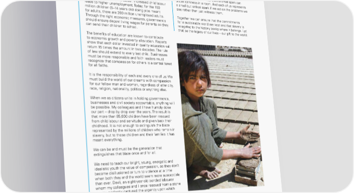 What are we waiting for? Sustainable societies begin with children need governments to make child-friendly policies and change if we channel our energies and our anger at invest adequately in education and young people. injustices in the right way. even a small spark can Governments can no longer ignore the economic dispel darkness in a room. and each of us represents arguments against child labour. increased child labour a small but critical spark if we act on the problems we leads to higher unemployment. Today, for the 150 see rather than just witness them. million children (5–14 years old) doing jobs meant for adults, there are 200 million unemployed adults. Together we can ensure that the commitments Through the right economic measures, governments for a sustainable world are kept and that slavery is should ensure decent living wages for parents so they relegated to the history books where it belongs. let can send their children to school. that be the legacy of our lives – our gift to the world. The benefits of education are known to contribute to economic growth and poverty alleviation. reports show that each dollar invested in quality education will return 15 times the amount in two decades. The rule of law should extend to every last child. Businesses must be more responsible and faith leaders must recognize that compassion for others is a central tenet for all faiths. it is the responsibility of each and every one of us: We must build the world of our dreams with compassion for our fellow man and woman, regardless of ethnicity, race, religion, nationality, politics or anything else. When we as citizens unite in holding governments, businesses and civil society accountable, anything will be possible. My colleagues and i have humbly done our part – drop by drop over the years. The result is that more than 85,000 children have been rescued from child labour and servitude and given back their childhood. it is not enough to extinguish the blaze represented by the millions of children who remain in slavery, but to those children and their families it has meant everything. We can be and must be the generation that extinguishes that blaze once and for all. We need to teach our bright, young, energetic and idealistic youth the value of compassion, so they don’t become disillusioned or turn to violence at a time when both they and the world seem more susceptible than ever. devli, an eight-year-old bonded labourer whom my colleagues and i once rescued from a stone quarry, perfectly captured the urgency upon which we must act. She asked me, “Why didn’t you come earlier?” her question is for all of us. What are we waiting A girl makes bricks at a factory in the Shahdra for? each one of us has the potential to bring about neighbourhood, north of Lahore, Pakistan. © UNICEF/UNI44028/Pirozzi The STaTe of The World’S Children 2016 87