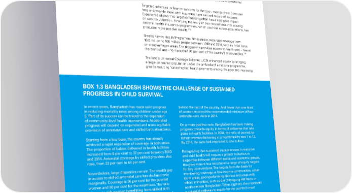 scenario in which all low-income countries meet more stringent standards for revenue allocation and health sector financing. While only indicative in nature, this estimate provides a valuable ballpark figure for the additional international public financing that would be needed to bring the 2030 child and maternal 114 health targets within reach. Targeted schemes to finance services for the poor, exempt them from user fees and provide them with insurance have a mixed record of success. experience shows that targeted financing often has a negligible impact on service utilization. financing the entry of poor households into existing national health insurance programmes, which pool risk across populations, has 115 produced more positive results. Brazil’s family health Programme, for example, expanded coverage from 10.6 million to 100 million people between 1998 and 2010, with an initial focus on disadvantaged areas. The programme provides access to health care – free at 116 the point of use – to more than 90 per cent of the country’s municipalities. Thailand’s Universal Coverage Scheme (UCS) enhanced equity by bringing a large uninsured population under the umbrella of a national programme, greatly reducing ’catastrophic‘ health payments among the poor and improving BOx 1.3 BANGLADESH SHOWS THE CHALLENGE OF SUSTAINED PROGRESS IN CHILD SURvIvAL In recent years, Bangladesh has made solid progress behind the rest of the country. And fewer than one third in reducing mortality rates among children under age of women received the recommended minimum of four 5. Part of its success can be traced to the expansion antenatal care visits in 2014. of community-level health interventions. Accelerated progress will depend on expanded and more equitable on a more positive note, Bangladesh has been making provision of antenatal care and skilled birth attendance. progress towards equity in terms of deliveries that take place in health facilities. In 2004, the ratio of poorest-to- Starting from a low base, the country has already richest women delivering in a health facility was 1 to 12. achieved a rapid expansion of coverage in both areas. By 2014, the ratio had improved to one to four. The proportion of babies delivered in health facilities increased from 8 per cent to 37 per cent between 2000 Recognizing that sustained improvements in maternal and 2014. Antenatal coverage by skilled providers also and child health will require a greater reduction in rose, from 33 per cent to 64 per cent. disparities between different social and economic groups, the government has introduced a range of equity targets Nevertheless, large disparities remain. The wealth gap for key interventions. The targets form the basis for in access to skilled antenatal care has declined only monitoring coverage in low-income communities, urban marginally. Coverage is 36 per cent for the poorest slum areas, poor-performing districts and areas with women and 90 per cent for the wealthiest. The ratio ethnic minorities, such as the Chittagong Hill Tracts in of poor-to-rich women benefitting from skilled birth south-eastern Bangladesh. Taken together, they represent attendance in 2014 was about one to four, with two of a potential pathway to equity for the country’s most the country’s divisions – Sylhet and Barisal – lagging far disadvantaged mothers and children. Source: national institute of Population research and Training (niPorT), Mitra and associates, and iCf international, Bangladesh demographic and health Survey 2014: Key indicators, dhaka, Bangladesh, and rockville, Maryland, USa, 2015. The STaTe of The World’S Children 2016 35