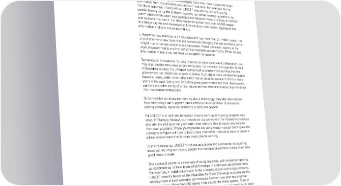 innovation in the development and humanitarian sectors is also about being open about failures as well as successes. it is about using technology to get information in new ways, at new speeds. in an emergency setting, social messaging tools now make it possible to get information from the affected populations in real time. for example, during the ebola epidemic in West africa, UniCef was able to talk with young people directly using the U-report system, our social messaging platform for communication between young people and decision makers. in liberia, UniCef and partners involved in the ebola response polled more than 43,000 people in a single day via text messages to find out about their needs, aggregate that information and take action accordingly. U-report is now available in 22 countries and has more than 2.1 million users. it is one of the many new tools that are dramatically changing the way problems come to light – and the way solutions are discovered. These tools add urgency to the work of governments and the rest of the international community. When we get information in real time, we have an obligation to respond. Technological innovations not only improve communication and collaboration, but they also provide new ways of gathering data. for instance, the Ugandan Bureau of Statistics is using the U-report survey tool to create micro surveys that the government can distribute via mobile phone. Such digital tools complement paper- based surveys, which often reflect information obtained several months or even years in the past. Using real-time data gives governments and their development partners a quicker sense of critical issues as they arise and enables them to direct their responses strategically. But innovative solutions are not only about technology; they also demonstrate how technology can support human behaviour as a key driver of success in solving complex, systemic problems in 2016 and beyond. for UniCef and partners, innovation means working with young people in new ways. in Blantyre, Malawi, our innovation lab works with the Polytechnic institute and primary and secondary schoolchildren who are able to design solutions to their own problems. These young people are using modern design techniques and concepts to figure out how to best shape their world – including ways to create a school environment that is more conducive to learning. in this relationship, UniCef functions as a broker and a convener, not pushing ideas but working with young people and institutional partners to help them take good ideas to scale. This approach points to a new way of doing business, with innovation opening up opportunities for new types of partnerships in areas such as personal data. for example, in collaboration with arM, a leading digital technology company, UniCef recently launched the Wearables for Good Challenge to accelerate the development of new wearable technologies that can help save and improve children’s lives. More than 250 teams from around the world applied. Most of them consisted of young people who believed they could work together on open- source technologies providing mothers in rural environments with the information they need to keep themselves and their children safe. innovating for equity is also about how to fund this work and make it real. UniCef's innovation fund, launched in 2015, is a novel instrument enabling us to support local entrepreneurs and designers in a very concrete sense. By creating a The STaTe of The World’S Children 2016 95