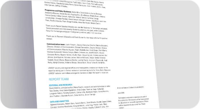 aCKnoWledGeMenTS This report is the result of collaboration among many individuals and institutions. The editorial and research team thank all who gave so willingly of their time, expertise and energy, in particular: Advisory Board: Yoka Brandt, Deputy Executive Director; Geeta rao Gupta, Deputy Executive Director; Gerard Bocquenet, Ted Chaiban, Sarah Cook, Paloma escudero, andres franco, Claudia Gonzalez romo, Goran holmqvist, Karin hulshof, afshan Khan, olav Kjørven, Jeffrey o’Malley. Programme and Policy Guidance: abdul alim, david anthony, ivelina Borisova, Josephine Bourne, nicola Brandt, Jingqing Chai, Kim dickson, Martin evans, antonio franco Garcia, Vidhya Ganesh, Katherine holland, Tamara Kummer, George laryea-adjei, dheepa Pandian, david Stewart, Morgan Strecker, Guy Taylor, Justin Van fleet, rudina Vojvoda, frank Borge Wietzke, alexandra Yuster, Maniza Zaman. Thank you to rachel Sabates-Wheeler and Jennifer Yablonski for the background paper, ‘Social protection and child poverty: evidence, practice, and gaps’, and to Gonzalo fanjul for the background paper ‘Child poverty and inequality in rich countries’. Thank you to ravneet ahluwalia and Vivek Kumar for their help with the Perspective essays. Communication team: Justin forsyth, Deputy Executive Director; Paloma escudero, Director, Division of Communication; edward Carwardine, Deputy Director, Division of Communication; Maurico aguayo, nigina Baykabulova, Gerrit Beger, Penni Berns, Marissa Buckanoff, Patricia Codyre, eliana drakopoulos, Jedd flanscha, Claudia Gonzalez romo, Bayann hamid, Chulho hyun, angus ingham, Malene Jensen, Ueli Johner, ariel Kastner, nicholas ledner, Marixie Mercado, najwa Mekki, Christine nesbitt, david ohana, rebecca obstler, laetitia Pactat, Katarzyna Pawelczyk, hugh reilly, abhijit Shanker, Melanie Sharpe, arissa Sidoti, Tanya Turkovich, Sonia Yeo. UniCef country and regional offices and headquarters divisions contributed to this report by taking part in formal reviews or commenting on drafts. Many field offices and UniCef national committees arranged to translate or adapt the report for local use. rePorT TeaM EDITORIAL AND RESEARCH Kevin Watkins, principal author; Maria Quattri, research and technical advice on data; Tara dooley, hirut Gebre-egziabher, anna Grojec, Yasmine hage, Catherine © United nations Children’s fund (UniCef) langevin-falcon, Timothy ledwith, Céline little, Baishalee nayak, Carlos Perellon, ami Pradhan, Charlotte rutsch, Zahra Sethna, Jordan Tamagni. June 2016 DATA AND ANALYTICS Permission is required to reproduce any part of agbessi amouzou, robert Bain, nassim Benali, david Brown, Claudia Cappa, liliana this publication. Permissions will be freely granted Carvajal, Karoline hassfurter, hiroyuki hattori, lucia hug, Priscilla idele, Claes to educational or non-profit organizations. others Johansson, Julia Krasevec, Vrinda Mehra, Padraic Murphy, Colleen Murray, Khin will be requested to pay a small fee. Please Wityee oo, nicole Petrowski, Tyler Porth, Shahrouh Sharif, Tom Slaymaker, Chiho contact: Suzuki, haogen Yao, danzhen You. division of Communication, UniCef PRODUCTION AND DISSEMINATION attn: Permissions Samantha Wauchope, Production Specialist; Germain ake, ernest Califra. 3 United nations Plaza, new York, nY 10017, USa Tel: +1 (212) 326-7434 DESIGN email: [email protected] Publication and graphic design for the latest data, please visit . Soapbox, www.soapbox.co.uk infographics on pages 3, 11, 42, 70 and 90. iSBn: 978-92-806-4838-6