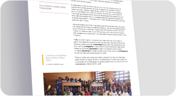 Reaching every child: The promise of equity >> Meeting the equity imperative child mortality. it argues that to meet the 2030 child survival target, we must urgently address persistent disparities in maternal health, the availability of skilled birth attendants, adequate nutrition and access to basic services, as well as other factors such as discrimination, exclusion and a lack of knowledge about child feeding and the role of safe water, adequate sanitation and hygiene in preventing childhood disease. The discussion continues with a look at one of the most effective drivers of Child PoVerTY iS aBoUT More development and the greatest equalizer of opportunity: education. Without Than inCoMe. quality education, disadvantaged children are far more likely to be trapped as adults in low-skilled, poorly paid and insecure employment, preventing them from breaking intergenerational cycles of disadvantage. But a greater focus on early childhood development, on increasing education access and quality, and on providing education in emergencies will yield cascading benefits for both this generation and the next. having discussed two of the most glaring deprivations children face, this report then examines child poverty in all its dimensions – and the role social protection programmes play in reducing it. arguing that child poverty is about more than income, it presents a case for combining measures to reduce income poverty with integrated solutions to the many deprivations experienced by children living in poverty. finally, as a call to action, the report concludes with a set of principles to guide more equity-focused policy, planning and public spending. These broad principles include expanding information about who is being left behind and why; improving integration to tackle the multiple dimensions of deprivation; fostering and fuelling innovation to reach the hardest-to-reach children; increasing investment in equity-focused programmes; and driving involvement by communities and citizens around the world. Lunchtime at Kotingli Basic School, Northern Region, These principles are a guide more than a blueprint, but they can help shape Ghana. policy, frame priorities and inform the debate about the best way to deliver on the promise of the 2030 goals and secure a better future not only for the most © UNICEF/UN04350/Logan disadvantaged children, but for us all. The STaTe of The World’S Children 2016 6