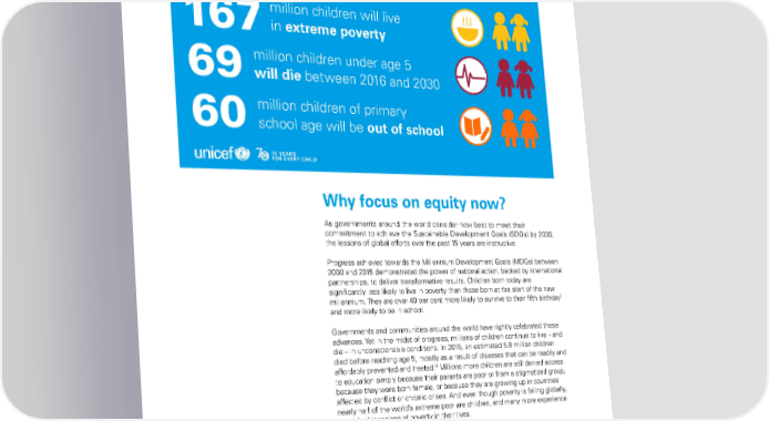 Unless the world tackles inequity today, in 2030: million children will live 167in extreme poverty million children under age 5 69will die between 2016 and 2030 million children of primary 60school age will be out of school Why focus on equity now? as governments around the world consider how best to meet their commitment to achieve the Sustainable development Goals (SdGs) by 2030, the lessons of global efforts over the past 15 years are instructive. Progress achieved towards the Millennium development Goals (MdGs) between 2000 and 2015 demonstrated the power of national action, backed by international partnerships, to deliver transformative results. Children born today are significantly less likely to live in poverty than those born at the start of the new 2 millennium. They are over 40 per cent more likely to survive to their fifth birthday and more likely to be in school. Governments and communities around the world have rightly celebrated these advances. Yet in the midst of progress, millions of children continue to live – and die – in unconscionable conditions. in 2015, an estimated 5.9 million children died before reaching age 5, mostly as a result of diseases that can be readily and 3 affordably prevented and treated. Millions more children are still denied access to education simply because their parents are poor or from a stigmatized group, because they were born female, or because they are growing up in countries affected by conflict or chronic crises. and even though poverty is falling globally, nearly half of the world’s extreme poor are children, and many more experience multiple dimensions of poverty in their lives. in many cases, equity gaps have narrowed over the past 25 years. for example, in all regions, the poorest households experienced greater absolute declines in child mortality than the richest. four regions achieved gender parity in primary education.4 But in far too many other cases, overall progress did little to narrow deep and persistent disparities. Governments failed to track the equity gaps separating the most disadvantaged children from the rest of society. national averages marking The STaTe of The World’S Children 2016 3