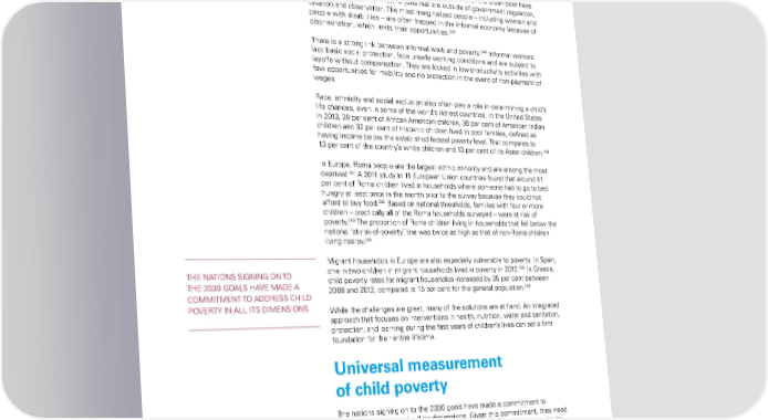 Children and poverty: Breaking the vicious cycle >> Universal measurement of child poverty The challenges facing children in poor urban communities are particularly relevant in light of the projection that 66 per cent of the world’s population will be urban in 2050, with the fastest urbanization on the african and asian 247 continents. excluded from other opportunities, many of the urban poor have little choice but to take informal jobs that are outside of government regulation, taxation and observation. The most marginalized people – including women and people with disabilities – are often trapped in the informal economy because of 248 discrimination, which limits their opportunities. There is a strong link between informal work and poverty.249 informal workers lack basic social protection, face unsafe working conditions and are subject to layoffs without compensation. They are locked in low-productivity activities with few opportunities for mobility and no protection in the event of non-payment of wages. race, ethnicity and social exclusion also often play a role in determining a child’s life chances, even in some of the world’s richest countries. in the United States in 2013, 39 per cent of african american children, 36 per cent of american indian children and 32 per cent of hispanic children lived in poor families, defined as having income below the established federal poverty level. That compares to 13 per cent of the country’s white children and 13 per cent of its asian children.250 in europe, roma people are the largest ethnic minority and are among the most 251 deprived. a 2011 study in 11 european Union countries found that around 41 per cent of roma children lived in households where someone had to go to bed hungry at least once in the month prior to the survey because they could not 252 afford to buy food. Based on national thresholds, families with four or more children – practically all of the roma households surveyed – were at risk of 253 poverty. The proportion of roma children living in households that fell below the national ‘at-risk-of-poverty’ line was twice as high as that of non-roma children 254 living nearby. Migrant households in europe are also especially vulnerable to poverty. in Spain, one in two children in migrant households lived in poverty in 2012.255 The naTionS SiGninG on To in Greece, The 2030 GoalS haVe Made a child poverty rates for migrant households increased by 35 per cent between 2008 and 2012, compared to 15 per cent for the general population.256 CoMMiTMenT To addreSS Child PoVerTY in all iTS diMenSionS. While the challenges are great, many of the solutions are at hand. an integrated approach that focuses on interventions in health, nutrition, water and sanitation, protection, and learning during the first years of children’s lives can set a firm foundation for their entire lifetime. Universal measurement of child poverty The nations signing on to the 2030 goals have made a commitment to address child poverty in all its dimensions. Given this commitment, they need consistently updated data on who is poor and how they are poor in order to monitor progress, identify gaps and guide policies and programmes – all in the interest of making sure that vulnerable children are not left behind. efforts to measure child poverty are not new. indeed, many countries have already taken steps to generate data on how many children are living in poverty, based on the international extreme-poverty threshold of US$1.90 a day, as well The STaTe of The World’S Children 2016 80