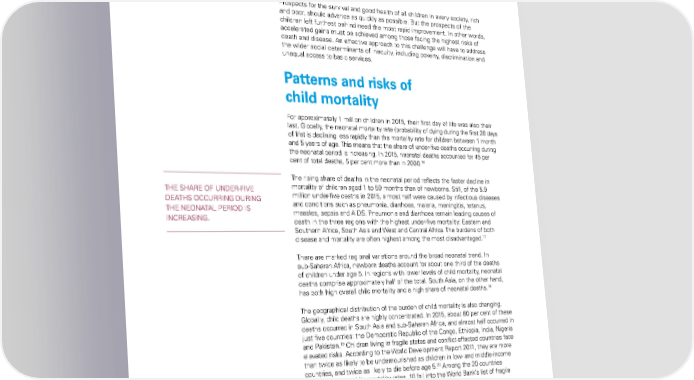 Child Health: A fair start in life >> Patterns and risks of child mortality narrowing the gaps between rich and poor countries is one of the defining challenges of our time. The starting point for achieving that outcome in child survival is to work towards bringing mortality rates among the poorest to the levels of the wealthiest within countries. Prospects for the survival and good health of all children in every society, rich and poor, should advance as quickly as possible. But the prospects of the children left furthest behind need the most rapid improvement. in other words, accelerated gains must be achieved among those facing the highest risks of death and disease. an effective approach to this challenge will have to address the wider social determinants of inequity, including poverty, discrimination and unequal access to basic services. Patterns and risks of child mortality for approximately 1 million children in 2015, their first day of life was also their last. Globally, the neonatal mortality rate (probability of dying during the first 28 days of life) is declining less rapidly than the mortality rate for children between 1 month and 5 years of age. This means that the share of under-five deaths occurring during the neonatal period is increasing. in 2015, neonatal deaths accounted for 45 per 16 cent of total deaths, 5 per cent more than in 2000. The rising share of deaths in the neonatal period reflects the faster decline in The Share of Under-fiVe mortality of children aged 1 to 59 months than of newborns. Still, of the 5.9 deaThS oCCUrrinG dUrinG million under-five deaths in 2015, almost half were caused by infectious diseases The neonaTal Period iS and conditions such as pneumonia, diarrhoea, malaria, meningitis, tetanus, inCreaSinG. measles, sepsis and aidS. Pneumonia and diarrhoea remain leading causes of death in the three regions with the highest under-five mortality: eastern and Southern africa, South asia and West and Central africa. The burdens of both disease and mortality are often highest among the most disadvantaged.17 There are marked regional variations around the broad neonatal trend. in sub-Saharan africa, newborn deaths account for about one third of the deaths of children under age 5. in regions with lower levels of child mortality, neonatal deaths comprise approximately half of the total. South asia, on the other hand, 18 has both high overall child mortality and a high share of neonatal deaths. The geographical distribution of the burden of child mortality is also changing. Globally, child deaths are highly concentrated. in 2015, about 80 per cent of these deaths occurred in South asia and sub-Saharan africa, and almost half occurred in just five countries: the democratic republic of the Congo, ethiopia, india, nigeria and Pakistan.19 Children living in fragile states and conflict-affected countries face elevated risks. according to the World development report 2011, they are more than twice as likely to be undernourished as children in low- and middle-income 20 countries, and twice as likely to die before age 5. among the 20 countries with the highest child mortality rates, 10 fall into the World Bank’s list of fragile contexts.21 in countries affected by conflict, damage to health systems threatens children’s lives. The Syrian arab republic, for instance, had made impressive progress in reducing under-five mortality prior to the current conflict there. Since 1990, the rate fell from 37 to 13 deaths per 1,000 live births. Since 2012, however, the country’s excess crisis mortality – that is, the under-five mortality attributable to crisis 22 conditions – has been an estimated one to two deaths per 1,000 live births. The STaTe of The World’S Children 2016 10