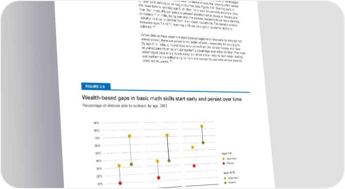 experiences at home set the stage for success in learning. While more than half of children aged 3 to nearly 5 in most countries are engaged by an adult in learning activities at home, less than half have access to three or more books at home.144 learning outcomes are also tied to the multiple kinds of advantages and disadvantages that children face. evidence shows that poverty often leaves children with deficits in learning outcomes (see Figure 2.6). Starting early in life, even before reaching age 5, children from poor households are more likely than their more affluent peers to present developmental delays in literacy and 145 numeracy. in india, being born into the poorest households carries a learning ‘penalty’ relative to children from the richest households. The penalty widens between ages 7 and 11, reaching a 19 per cent gap in students’ ability to 146 subtract. When children face wealth-related disadvantages and have parents who did not attend school, there are powerful multiplier effects – especially for young girls. By age 11 in india, girls and boys who come from the richest homes and have educated parents enjoy a huge academic advantage over other children. The most advantaged boys and girls are about six times more likely to learn basic reading and mathematics skills than girls from the poorest households whose parents were not educated.147 FIGURE 2.6 Wealth-based gaps in basic math skills start early and persist over time Percentage of children able to subtract, by age, 2012 90% 80% 70% 60% 50% 40% Ages 7–8: Wealthiest 30% Poorest 20% Ages 10–11: 10% Wealthiest 0 Poorest india Pakistan Kenya Note: While indian and Kenyan children should have completed Grade 2 by age 8, Pakistani children should have completed Grade 3 by age 8. Source: aSer india, aSer Pakistan and Uwezo Kenya survey data from 2012, in rose, Pauline, and Benjamin alcott, How can education systems become equitable by 2030?: DFID think pieces – Learning and equity, United Kingdom department for international development, london, august 2015. The STaTe of The World’S Children 2016 49