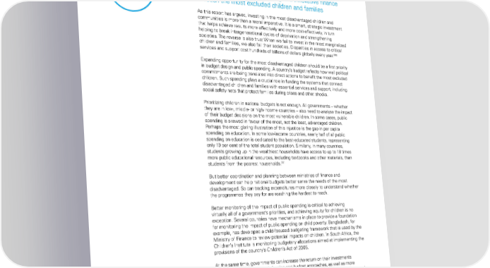 Investment Using equity-focused budgeting and innovative finance to reach the most excluded children and families as this report has argued, investing in the most disadvantaged children and communities is more than a moral imperative. it is a smart, strategic investment that helps achieve results more effectively and more cost-effectively, in turn helping to break intergenerational cycles of deprivation and strengthening societies. The reverse is also true: When we fail to invest in the most marginalized children and families, we also fail their societies. disparities in access to critical 280 services and support cost hundreds of billions of dollars globally every year. expanding opportunity for the most disadvantaged children should be a first priority in budget design and public spending. a country’s budget reflects how well political commitments are being translated into direct actions to benefit the most excluded children. Such spending plays a crucial role in funding the systems that connect disadvantaged children and families with essential services and support, including social safety nets that protect families during crises and other shocks. Prioritizing children in national budgets is not enough. all governments – whether they are in low-, middle- or high-income countries – also need to analyse the impact of their budget decisions on the most vulnerable children. in some cases, public spending is skewed in favour of the most, not the least, advantaged children. Perhaps the most glaring illustration of this injustice is the gap in per capita spending on education. in some low-income countries, nearly half of all public spending on education is dedicated to the best-educated students, representing only 10 per cent of the total student population. Similarly, in many countries, students growing up in the wealthiest households have access to up to 18 times more public educational resources, including textbooks and other materials, than 281 students from the poorest households. But better coordination and planning between ministries of finance and development can help national budgets better serve the needs of the most disadvantaged. So can tracking expenditures more closely to understand whether the programmes they pay for are reaching the hardest to reach. Better monitoring of the impact of public spending is critical to achieving virtually all of a government’s priorities, and achieving equity for children is no exception. Several countries have mechanisms in place to provide a foundation for monitoring the impact of public spending on child poverty. Bangladesh, for example, has developed a child-focused budgeting framework that is used by the Ministry of finance to review potential impacts on children. in South africa, the Children’s institute is monitoring budgetary allocations aimed at implementing the provisions of the country’s Children’s act of 2005. at the same time, governments can increase the return on their investments by adopting more integrated planning and budget approaches, as well as more integrated programme delivery across sectors, as this chapter has already discussed. in the midst of funding shortfalls and increasing competition for official development assistance and humanitarian aid, low- and middle-income countries and their development partners are finding new ways of filling gaps in funding and securing more predictable and diversified funding sources. While targeted, short-term investments can often break bottlenecks that prevent children and The STaTe of The World’S Children 2016 97