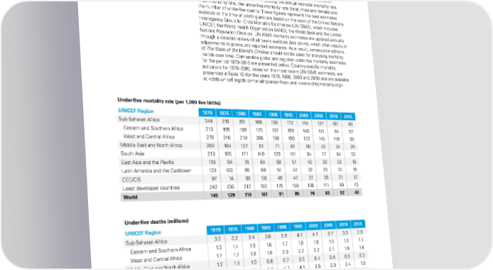 Child mortality estimates Each year, in The State of the World’s Children, UNICEF reports a series of mortality estimates for children – including the annual neonatal mortality rate, infant mortality rate, the under-five mortality rate (total, male and female) and the number of under-five deaths. These figures represent the best estimates available at the time of printing and are based on the work of the United Nations Inter-agency Group for Child Mortality Estimation (UN IGME), which includes UNICEF, the World Health Organization (WHO), the World Bank and the United Nations Population Division. UN IGME mortality estimates are updated annually through a detailed review of all newly available data points, which often results in adjustments to previously reported estimates. As a result, consecutive editions of The State of the World’s Children should not be used for analysing mortality trends over time. Comparable global and regional under-five mortality estimates for the period 1970–2015 are presented below. Country-specific mortality indicators for 1970–2015, based on the most recent UN IGME estimates, are presented in Table 10 (for the years 1970, 1990, 2000 and 2015) and are available at and . Under-five mortality rate (per 1,000 live births) UNICEF Region 1970 1975 1980 1985 1990 1995 2000 2005 2010 2015 Sub-Saharan Africa 244 219 201 188 180 172 154 127 101 83 Eastern and Southern Africa 213 195 189 175 167 159 140 111 84 67 West and Central Africa 276 246 218 206 198 190 172 145 119 99 Middle East and North Africa 200 164 127 91 71 61 50 42 34 29 South Asia 213 195 171 149 129 111 94 77 64 53 East Asia and the Pacific 116 94 76 64 58 51 42 30 23 18 Latin America and the Caribbean 120 103 85 68 54 42 32 25 24 18 CEE/CIS 97 74 69 56 48 47 37 28 21 17 Least developed countries 242 230 212 192 175 158 138 111 90 73 World 145 129 116 101 91 85 76 63 52 43 Under-five deaths (millions) UNICEF Region 1970 1975 1980 1985 1990 1995 2000 2005 2010 2015 Sub-Saharan Africa 3.2 3.2 3.4 3.6 3.9 4.1 4.1 3.7 3.3 2.9 Eastern and Southern Africa 1. 3 1. 4 1. 6 1. 6 1. 7 1. 8 1. 8 1. 5 1. 3 1. 1 West and Central Africa 1. 7 1. 7 1. 8 1. 9 2.0 2.2 2.2 2.1 1. 9 1. 8 Middle East and North Africa 1. 2 1. 1 1. 0 0.8 0.7 0.5 0.4 0.4 0.3 0.3 South Asia 5.8 5.8 5.5 5.3 4.7 4.1 3.5 2.9 2.4 1. 9 East Asia and the Pacific 5.0 3.5 2.4 2.4 2.5 1. 6 1. 2 0.9 0.7 0.5 Latin America and the Caribbean 1. 2 1. 1 1. 0 0.8 0.6 0.5 0.4 0.3 0.3 0.2 CEE/CIS 0.6 0.5 0.5 0.4 0.4 0.3 0.2 0.1 0.1 0.1 Least developed countries 3.3 3.5 3.6 3.6 3.6 3.6 3.4 3.0 2.5 2.2 World 17. 2 15.6 13.9 13.4 12.7 11.0 9.8 8.3 7. 0 5.9 THE STATE OF THE WORLD’S CHILDREN 2016 109
