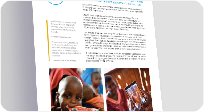 Innovation accelerating change for the most disadvantaged children by using new and different approaches to development for UniCef, innovation means doing our work in a different way that adds value to children’s lives. innovation is not a value in itself but, rather, a new approach to solving difficult problems. UniCef has a long history of supporting innovation for children. We have pioneered and collaborated on solutions such as the Mark ii handpump (to improve access to safe water) and ready-to-use therapeutic food (to treat severe A child receives ready-to-use acute malnutrition). and we found new ways of working with governments and therapeutic food as part of a other partners to increase global immunization rates of children under age 5, from package of services for the 20 per cent to 76 per cent, in a single decade (1980–1990). treatment of malnutrition, in The evolving challenges now facing the world’s children – from disease outbreaks Somalia. to the migrant and refugee crisis, to the situation of millions of out-of-school © UNICEF/UNI201564/Rich children – have one thing in common: the great speed at which they are disrupting young lives. Meeting these challenges means, yet again, reinventing our ways of A woman is photographed for working. it means being agile and adaptable in how we build solutions. it means the Rapid Family Tracing and looking towards new partnerships – including collaborations with companies that Reunification mobile phone might not be our traditional partners, and with young people themselves. application in the Nyarugusu refugee camp, in Kigoma Region, in an increasingly connected world, more and more people are accessing basic Burundi. information services. as a result, the global drive for new solutions is engaging more and more young people not only as beneficiaries of solutions but also as © UNICEF/UNI188792/Beechey problem-solvers in their own right. The STaTe of The World’S Children 2016 94