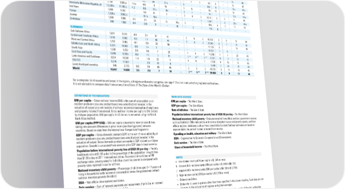 TABLE 7. ECONOMIC INDICATORS Population Debt Average below National ODA service annual international monetary ODA inflow as a % of GNI per capita (US$) GDP per capita rate of poverty line child Public spending as a inflow in as a % of exports of Share of Countries average annual inflation of US$1.90 poverty % of GDP (2009–2013*) millions recipient goods and household income US$ PPP US$ growth rate (%) (%) per day (%) (%) allocated to: US$ GNI services (%, 2009–2013*) and areas 2014 2014 1970–1990 1990–2014 1990–2014 2009–2013* 2010–2014* health education military 2014 2014 2013 poorest 40% richest 20% United Kingdom 43,430 39,040 2.2 1.8 2 – – 8 6 2 – – – 20 40 United Republic of Tanzania 920 2,510 – 2.5 14 47 – 3 5 1 2,648 6 2 19 46 United States 55,200 55,860 2.2 1.6 2 – – 8 5 5 – – – 15 46 Uruguay 16,350 20,220 0.9 2.5 14 0 – 5 4 2 89 0 – 15 48 Uzbekistan 2,090 5,830 e – 3.2 64 67x – 3 – – 324 0 – 19x 43x Vanuatu 3,160 3,030 e 1.1 x 0.6 3 15 – 3 5 – 98 12 1 18 44 Venezuela (Bolivarian Republic of) 12,500 x 17,700 x -1.2 0.6 31x 9x – 2 7 1 41 – – 12x 51x Viet Nam 1,890 5,350 – 5.5 11 3 – 3 6 2 4,218 2 3 17 46 Yemen 1,300 x 3,650 x – 0.7 x 15x – – 1 – 5 1,164 – 2 20x 44x Zambia 1,680 3,690 -2.4 2.4 24 64 65y 3 – 1 995 4 3 11 61 Zimbabwe 840 1,650 -0.4 -2.8 3 – 78 – 2 1 758 6 – – – SUMMARY Sub-Saharan Africa 1,661 3,416 -0.1 2.4 17 47 – 3 5 2 40,706 2 6 16 49 Eastern and Southern Africa 1,610 3,383 0.3 1.7 10 41 – 3 5 2 22,543 3 7 16 51 West and Central Africa 1,703 3,405 -0.7 2.8 22 56 – – – – 17,129 2 – 16 48 Middle East and North Africa 6,561 14,047 0.8 1.4 11 – – – – – 20,921 1 6 – – South Asia 1,500 5,297 2.0 4.6 7 22 – 1 4 2 15,360 1 7 20 43 East Asia and Pacific 6,845 12,983 6.0 7.7 5 11 – 3** 4** 2** 8,723 0 3 15 47 Latin America and Caribbean 9,634 14,247 1.4 1.8 22 5 – 4 6 1 7,739 0 15 12 55 CEE/CIS 9,216 17,627 – 2.8 43 0 – – – – 9,549 1 24 19 44 Least developed countries 845 2,133 0.0 3.1 19 45 – 2 3 2 43,726 5 4 18 45 World 10,647 14,633 2.5 2.9 7 18 – 7** 5** 2** 101,963 0 8 17 46 For a complete list of countries and areas in the regions, subregions and country categories, see page 112 or visit . It is not advisable to compare data from consecutive editions of The State of the World’s Children. DEFINITIONS OF THE INDICATORS MAIN DATA SOURCES GNI per capita – Gross national income (GNI) is the sum of value added by all GNI per capita – The World Bank. resident producers plus any product taxes (less subsidies) not included in the GDP per capita – The World Bank. valuation of output plus net receipts of primary income (compensation of employees Rate of inflation – The World Bank. and property income) from abroad. Gross national income per capita is GNI divided by midyear population. GNI per capita in US dollars is converted using the World Population below international poverty line of US$1.90 per day – The World Bank. Bank Atlas method. National monetary child poverty – Data are compiled from official national government sources GNI per capita (PPP US$) – GNI per capita converted to international dollars such as Statistical Office tabulations and national household survey and poverty reports, and from taking into account differences in price levels (purchasing power) between official regional databases such as those compiled by Eurostat. National estimates are based on countries. Based on data from the International Comparison Programme. representative household income or expenditure surveys. GDP per capita – Gross domestic product (GDP) is the sum of value added by all Spending on health, education and military – The World Bank. resident producers plus any product taxes (less subsidies) not included in the ODA – Organisation for Economic Co-operation and Development. valuation of output. Gross domestic product per capita is GDP divided by midyear population. Growth is calculated from constant price GDP data in local currency. Debt service – The World Bank. Population below international poverty line of US$1.90 per day – Poverty Share of household income – The World Bank. headcount ratio at $1.90 a day is the percentage of the population living on less than $1.90 a day at 2011 international prices. As a result of revisions in PPP exchange rates, poverty rates for individual countries cannot be compared with NOTES poverty rates reported in earlier editions. a low-income country (GNI per capita is $1,045 or less). National monetary child poverty – Percentage of children aged 0–17 years old b lower-middle-income country (GNI per capita is $1,046 to $4,125). living in households with income or consumption below the government defined c upper-middle-income country (GNI per capita is $4,126 to $12,735). national monetary poverty threshold. d high-income country (GNI per capita is $12,736 or more). ODA – Net official development assistance. – Data not available. Debt service – Sum of interest payments and repayments of principal on external public and publicly guaranteed long-term debts. x Data refer to years or periods other than those specified in the column heading. Such data are not Share of household income – Percentage of income received by the 20 per cent included in the calculation of regional and global averages. of households with the highest income and by the 40 per cent of households with y Data differ from the standard definition or refer to only part of a country. If they fall within the the lowest income. reference period, such data are included in the calculation of regional and global averages. e Estimate is based on regression; other PPP figures are extrapolated from the 2011 International Comparison Programme benchmark estimates. * Data refer to the most recent year available during the period specified in the column heading. ** Excludes China. THE STATE OF THE WORLD’S CHILDREN 2016 145