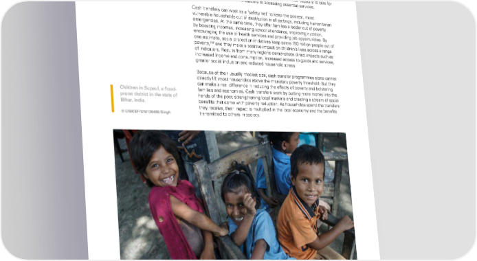 Children and poverty: Breaking the vicious cycle >> The role of cash transfers in reducing poverty and inequality education – but also to make sure the most disadvantaged children have access to those services. Social protection mechanisms such as pensions, fee waivers, child support grants and cash transfers are an effective approach that can reduce vulnerability to poverty and deprivation, strengthen families’ capacity to care for their children and overcome barriers to accessing essential services. Cash transfers can work as a ‘safety net’ to keep the poorest, most vulnerable households out of destitution in all settings, including humanitarian emergencies. at the same time, they offer families a ladder out of poverty by boosting incomes, increasing school attendance, improving nutrition, encouraging the use of health services and providing job opportunities. By one estimate, social protection initiatives keep some 150 million people out of 258 poverty, and they make a positive impact on children’s lives across a range of indicators. results from many regions demonstrate direct impacts such as increased income and consumption, increased access to goods and services, greater social inclusion and reduced household stress. Because of their usually modest size, cash transfer programmes alone cannot directly lift most households above the monetary poverty threshold. But they can make a real difference in reducing the effects of poverty and bolstering Children in Supaul, a flood- families and economies. Cash transfers work by putting more money into the prone district in the state of hands of the poor, strengthening local markets and creating a stream of social Bihar, India. benefits that come with poverty reduction. as households spend the transfers they receive, their impact is multiplied in the local economy and the benefits © UNICEF/UNI130498/Singh transmitted to others in society. The STaTe of The World’S Children 2016 82
