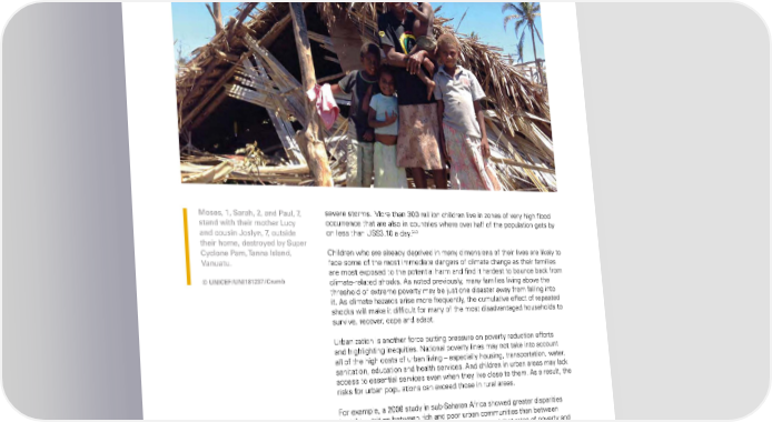 Moses, 1, Sarah, 2, and Paul, 7, severe storms. More than 300 million children live in zones of very high flood stand with their mother Lucy occurrence that are also in countries where over half of the population gets by on less than US$3.10 a day.243 and cousin Joslyn, 7, outside their home, destroyed by Super Cyclone Pam, Tanna Island, Children who are already deprived in many dimensions of their lives are likely to Vanuatu. face some of the most immediate dangers of climate change as their families are most exposed to the potential harm and find it hardest to bounce back from © UNICEF/UNI181237/Crumb climate-related shocks. as noted previously, many families living above the threshold of extreme poverty may be just one disaster away from falling into it. as climate hazards arise more frequently, the cumulative effect of repeated shocks will make it difficult for many of the most disadvantaged households to survive, recover, cope and adapt. Urbanization is another force putting pressure on poverty reduction efforts and highlighting inequities. national poverty lines may not take into account all of the high costs of urban living – especially housing, transportation, water, sanitation, education and health services. and children in urban areas may lack access to essential services even when they live close to them. as a result, the risks for urban populations can exceed those in rural areas. for example, a 2006 study in sub-Saharan africa showed greater disparities in child nutrition between rich and poor urban communities than between 244 urban and rural areas. a 2012 study in egypt found that rates of poverty and deprivation among some children in urban slums reached or exceeded those in the country’s most deprived rural areas.245 and for the many children in China who have migrated to cities with their families, holding a hukou household registration from a rural area often means they are not entitled to urban health, 246 education and other critical services. The STaTe of The World’S Children 2016 79