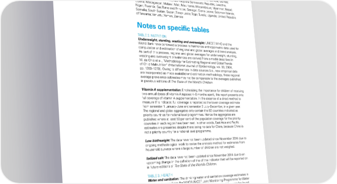 Afghanistan; Angola; Bangladesh; Benin; Bhutan; Burkina Faso; Burundi; Cambodia; Central African Republic; Chad; Comoros; Democratic Republic of the Congo; Djibouti; Equatorial Guinea; Eritrea; Ethiopia; Gambia; Guinea; Guinea-Bissau; Haiti; Kiribati; Lao People’s Democratic Republic; Lesotho; Liberia; Madagascar; Malawi; Mali; Mauritania; Mozambique; Myanmar; Nepal; Niger; Rwanda; Sao Tome and Principe; Senegal; Sierra Leone; Solomon Islands; Somalia; South Sudan; Sudan; Timor-Leste; Togo; Tuvalu; Uganda; United Republic of Tanzania; Vanuatu; Yemen; Zambia Notes on specific tables TABLE 2. NUTRITION Underweight, stunting, wasting and overweight: UNICEF, WHO and the World Bank have continued a process to harmonize anthropometric data used for computation and estimation of regional and global averages and trend analysis. As part of this process, regional and global averages for underweight, stunting, wasting and overweight prevalences are derived from a model described in M. de Onis et al., ‘Methodology for Estimating Regional and Global Trends of Child Malnutrition’ (International Journal of Epidemiology, vol. 33, 2004, pp. 1260–1270). Owing to differences in data sources (i.e., new empirical data are incorporated as made available) and estimation methodology, these regional average prevalence estimates may not be comparable to the averages published in previous editions of The State of the World’s Children. Vitamin A supplementation: Emphasizing the importance for children of receiving two annual doses of vitamin A (spaced 4–6 months apart), this report presents only full coverage of vitamin A supplementation. In the absence of a direct method to measure this indicator, full coverage is reported as the lower coverage estimate from semester 1 January–June and semester 2 July–December, in a given year. The regional and global aggregates only contain the 82 countries indicated as priority countries for national level programmes. Hence the aggregates are published where at least 50 per cent of the population coverage for the priority countries in each region have been met. In other words, East Asia and Pacific estimates are presented despite there being no data for China, because China is not a priority country for a national level programme. Low birthweight: The data have not been updated since November 2014 due to ongoing methodological work to revise the analysis method for estimates from household surveys where a large number of children are not weighed. Iodized salt: The data have not been updated since November 2014 due to an upcoming change in the definition of the of the indicator that will be reported on in future editions of The State of the World’s Children. TABLE 3. HEALTH Water and sanitation: The drinking water and sanitation coverage estimates in this report come from the WHO/UNICEF Joint Monitoring Programme for Water Supply and Sanitation (JMP). Full details of the JMP methodology can be found at and . As the JMP estimates use linear regression applied to data from household sample surveys and censuses, and additional data become available between each issue of estimates, subsequent JMP estimates should not be compared. THE STATE OF THE WORLD’S CHILDREN 2016 113
