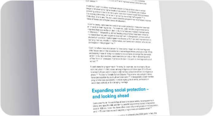 Children and poverty: Breaking the vicious cycle >> Expanding social protection – and looking ahead Cash transfers can also address some of the determinants of educational disadvantage, helping to break the link between poverty and school 266 drop-out rates. in Morocco, a cash transfer programme led to a significant 267 improvement in school participation. evidence shows that cash transfers 268 have increased demand for education and improved school enrolment and 269 attendance. in addition, cash transfers have been shown to help children stay in school longer and advance to higher levels of education.in Cambodia, an initiative providing scholarships to at-risk pupils from low-income households increased the average time they remained in school by more than half a grade.270 in Colombia, Ghana and Pakistan, cash transfers programmes have helped improve rates of transition to higher levels of education. in some cases, cash transfers and other social protection measures have had an impact on learning as well. for example, cash transfer programmes led to improved test scores for children in Burkina faso and modest improvements in Morocco.271 Meanwhile, school feeding programmes have been linked to increased learning and cognitive development. in Bangladesh, primary school students in a school meal programme showed a 15.7 per cent improvement in learning metrics, mostly in mathematics, compared with children who did not 272 participate in the programme. Cash transfers have also proven to have some impact on child marriage and child labour and on the educational disadvantages these practices entail. While addressing these child rights violations is a complex challenge that demands action in multiple sectors, cash transfers can play a role in alleviating some of the financial pressures that force children into work or marriage and out of 273 school. a cash transfer programme in Panama, for example, led to a nearly 16 per cent reduction in child labour among indigenous children aged 12 to 15 and to a nearly 8 per cent increase in elementary school enrolment in indigenous 274 areas. Pakistan’s female School Stipend Programme reduced girls’ labour- 275 force participation by as much as 5 per cent. in Bangladesh, a cash transfer programme was successful in encouraging girls to enrol, particularly in secondary school, and in delaying marriage. Expanding social protection – and looking ahead every country in the world has at least one social safety net programme in place, and specific child and family benefit programmes rooted in legislation exist in 108 countries. Yet these often cover only small groups of the population, and in 75 countries no such targeted programmes are available at all.276 expanding social protection is critical to achieving the 2030 goals. in fact, the goals include a specific target on implementing nationally appropriate social protection systems and measures to achieve substantial coverage of the poor and vulnerable by 2030. a universal approach to expanding social protection would not only increase coverage but would also reduce the chances of mistakenly excluding eligible households, create social solidarity and reduce the stigma that is sometimes The STaTe of The World’S Children 2016 84