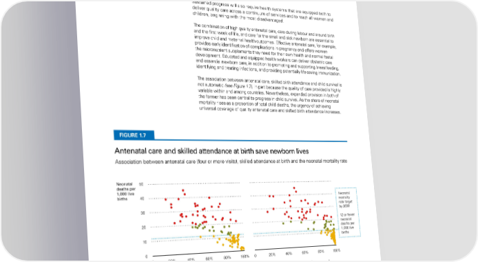Benefits of universal health coverage Sustained progress will also require health systems that are equipped both to deliver quality care across a continuum of services and to reach all women and children, beginning with the most disadvantaged. The combination of high quality antenatal care, care during labour and around birth and the first week of life, and care for the small and sick newborn are essential to improve child and maternal health outcomes. effective antenatal care, for example, provides early identification of complications in pregnancy and offers women the micronutrient supplements they need for their own health and normal foetal development. educated and equipped health workers can deliver obstetric care and essential newborn care, in addition to promoting and supporting breastfeeding, identifying and treating infections, and providing potentially life-saving immunization. The association between antenatal care, skilled birth attendance and child survival is not automatic (see Figure 1.7), in part because the quality of care provided is highly variable within and among countries. nevertheless, expanded provision in both of the former has been central to progress in child survival. as the share of neonatal mortality rises as a proportion of total child deaths, the urgency of achieving universal coverage of quality antenatal care and skilled birth attendance increases. FIGURE 1.7 Antenatal care and skilled attendance at birth save newborn lives association between antenatal care (four or more visits), skilled attendance at birth and the neonatal mortality rate Neonatal 50 deaths per 1,000 live births 40 neonatal mortality rate target 30 by 2030 12 or fewer 20 neonatal deaths per 1,000 live 10 births 0 0 20% 40% 60% 80% 100% 0 20% 40% 60% 80% 100% Women attended 4+ times during last pregnancy Births attended by skilled personnel Neonatal mortality rate low ≤12 Medium (13–20) high ≥20 Source: for neonatal mortality rate, Un iGMe 2015 estimates. for antenatal care and skilled attendance at birth, UniCef global databases, 2015, based on MiCS, dhS and other national sources. The STaTe of The World’S Children 2016 29