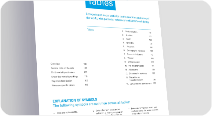 Statistical Tables Economic and social statistics on the countries and areas of the world, with particular reference to children’s well-being. Tables 1. Basic indicators 118 2. Nutrition 122 3. Health 126 4. HIV/AIDS 130 5. Education 134 6. Demographic indicators 138 7. Economic indicators 142 8. Women 146 9. Child protection 150 Overview 108 10. The rate of progress 154 General note on the data 108 11. Adolescents 158 Child mortality estimates 109 12. Disparities by residence 162 Under-five mortality rankings 110 13. Disparities by Regional classification 112 household wealth 166 Notes on specific tables 113 14. Early childhood development 170 EXPLANATION OF SYMBOLS The following symbols are common across all tables: – Data are not available. y Data differ from the standard * Data refer to the most recent year definition or refer to only part of available during the period specified x Data refer to years or periods other a country. If they fall within the in the column heading. than those specified in the column noted reference period, such data heading. Such data are not included are included in the calculation of ** Excludes China. in the calculation of regional and regional and global averages. global averages, unless otherwise noted. Sources and years for specific data points are available at . Symbols that appear in specific tables are explained in the footnotes to those tables. THE STATE OF THE WORLD’S CHILDREN 2016 107