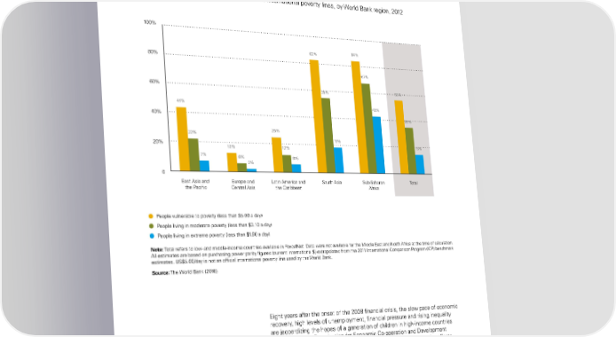 Children and poverty: Breaking the vicious cycle >> Poor children living in rich countries FIGURE 3.3 More than half of the population in low- and middle-income countries live on less than US$5 a day Percentage of population living below various international poverty lines, by World Bank region, 2012 100% 82% 84% 80% 67% 60% 55% 55% 44% 43% 40% 35% 25% 22% 19% 20% 13% 12% 15% 7% 6% 6% 2% 0 east asia and europe and latin america and South asia Sub-Saharan Total the Pacific Central asia the Caribbean africa People vulnerable to poverty (less than $5.00 a day) People living in moderate poverty (less than $3.10 a day) People living in extreme poverty (less than $1.90 a day) Note: Total refers to low- and middle-income countries available in Povcalnet. data were not available for the Middle east and north africa at the time of calculation. all estimates are based on purchasing power parity figures (current international $) extrapolated from the 2011 international Comparison Program (iCP) benchmark estimates. US$5.00/day is not an official international poverty line used by the World Bank. Source: The World Bank (2016). eight years after the onset of the 2008 financial crisis, the slow pace of economic recovery, high levels of unemployment, financial pressure and rising inequality are jeopardizing the hopes of a generation of children in high-income countries belonging to the organisation for economic Co-operation and development 235 (oeCd). at the same time, children and poor families are feeling the effects of deficit reduction programmes initiated by governments in response to the 236 crisis. in the 41 most affluent countries, nearly 77 million children lived in monetary poverty 237 in 2014. Taking pre-crisis levels as an anchor point, child poverty rates increased in 23 oeCd countries after 2008. in five countries, child poverty rates increased by 238 more than 50 per cent. in most countries in the european Union, the proportion of children in poverty is higher than the rate for adults (see Figure 3.4). The STaTe of The World’S Children 2016 76