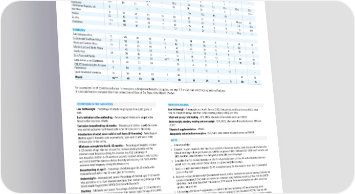 TABLE 2. NUTRITION Early Exclusive Introduction Minimum Underweight Stunting Wasting Overweight Vitamin A initiation breast- to solid, acceptable Breast- (%) (%) (%) (%) supplemen- Adequately Low of breast- feeding semi-solid or diet 6–23 feeding tation, full iodized salt birthweight feeding <6 months soft foods 6–8 months at age 2 coverageΔ consumption Countries (%) (%) (%) months (%) (%) (%) moderate & severeɵ (%) (%) and areas 2009–2013* 2010–2015* 2010–2015* 2014 2009–2013* United Kingdom 7 – – – – – – – – – – – United Republic of Tanzania 8 51 41 90 – 48 13 35 4 – 88α 56 United States 8 – – – – – 1 2 1 6 – – Uruguay 8 77 – – – – 4 11 1 7 – – Uzbekistan 5x 67x 26x 47x – 38x 4x 20x 5x 13x 99α 53x Vanuatu 10x 85 73 72 – 49 11 29 4 5 – 23x Venezuela 9 – 7x – – – 3x 13x 4x 6x – – (Bolivarian Republic of) Viet Nam 5 27 24 91 59 22 12 19 6 5 94α,w 45 Yemen 32 53 10 69 15 45 16 47 16 2 7α 30x Zambia 11x 66 73 82 11 42 15 40 6 6 –α 64x Zimbabwe 11 59 41 87 13 17 11 28 3 4 32α –f SUMMARY Sub-Saharan Africa 13 49 40 69 9 52 19 36 8 4 74 59 Eastern and Southern Africa 11 59 54 73 10 60 16 36 6 5 62 – West and Central Africa 14 40 29 68 9 46 22 35 10 4 83 65 Middle East and North Africa – 45 35 61 – 33 7 18 8 9 – – South Asia 28 39 46 57 – 75 30 37 15 4 62 69 East Asia and Pacific – 44 31 69 41** 24 5 11 4 6 86 86 Latin America and Caribbean 9 49 32 88 – 28 3 10 1 7 – – CEE/CIS (excluding the Russian 6 54 27 – – 29 2 10 2 14 – – Federation) Least developed countries 14 55 47 66 11 63 – – – – 67 50 World 16** 44 39 66 – 49 14 24 8 5 69 75 For a complete list of countries and areas in the regions, subregions and country categories, see page 112 or visit . It is not advisable to compare data from consecutive editions of The State of the World’s Children. DEFINITIONS OF THE INDICATORS MAIN DATA SOURCES Low birthweight – Percentage of infants weighing less than 2,500 grams at Low birthweight – Demographic and Health Surveys (DHS), Multiple Indicator Cluster Surveys (MICS), other birth. national household surveys, data from routine reporting systems, UNICEF and WHO. Early initiation of breastfeeding – Percentage of infants who are put to the Infant and young child feeding – DHS, MICS, other national household surveys and UNICEF. breast within one hour of birth. Underweight, stunting, wasting and overweight – DHS, MICS, other national household surveys, WHO and Exclusive breastfeeding <6 months – Percentage of children aged 0–5 months UNICEF. who are fed exclusively with breast milk in the 24 hours prior to the survey. Vitamin A supplementation – UNICEF. Introduction of solid, semi-solid or soft foods (6–8 months) – Percentage of Adequately iodized salt consumption – DHS, MICS, other national household surveys and UNICEF. children aged 6–8 months who received solid, semi-solid or soft foods in the 24 hours prior to the survey. NOTES Minimum acceptable diet (6–23 months) – Percentage of breastfed children – Data not available. 6–23 months of age who had at least the minimum dietary diversity and the x Data refer to years or periods other than those specified in the column heading. Such data are not included in the minimum meal frequency during the previous day AND percentage of calculation of regional and global averages, with the exception of 2005–2006 and 2007–2008 data from India, and non-breastfed children 6–23 months of age who received at least 2 milk feedings 2008 data from China. Estimates from data years prior to 2000 are not displayed. and had at least the minimum dietary diversity not including milk feeds and the minimum meal frequency during the previous day. y Data differ from the standard definition or refer to only part of a country. If they fall within the noted reference Breastfeeding at age 2 – Percentage of children aged 20–23 months who period, such data are included in the calculation of regional and global averages. received breast milk in the 24 hours prior to the survey. p Based on small denominators (typically 25–49 unweighted cases). No data based on fewer than 25 unweighted Underweight – Moderate and severe: Percentage of children aged 0–59 months cases are displayed. who are below minus two standard deviations from median weight-for-age of the ɵ Regional averages for underweight (moderate and severe), stunting (moderate and severe), wasting (moderate and World Health Organization (WHO) Child Growth Standards. severe) and overweight (moderate and severe) are estimated using statistical modeling of data from the UNICEF- Stunting – Moderate and severe: Percentage of children aged 0–59 months who WHO-World Bank Joint Global Nutrition Database, 2015 revision. For more information see . Child Growth Standards. r Full coverage with vitamin A supplements is reported as the lower percentage of 2 annual coverage points Wasting – Moderate and severe: Percentage of children aged 0–59 months who (i.e., lower point between semester 1 (January–June) and semester 2 (July–December) of 2014). Data are only are below minus two standard deviations from median weight-for-height of the presented for VAS priority countries; thus aggregates are only based on and representative of these priority countries. WHO Child Growth Standards. w Identifies countries with national vitamin A supplementation programmes targeted towards a reduced age range. Overweight – Moderate and severe: Percentage of children aged 0–59 months Coverage figure is reported as targeted. who are above two standard deviations from median weight-for-height of the α Identifies countries that are designated ‘priority’. Priority countries for national vitamin A supplementation WHO Child Growth Standards. programmes are identified as those having high under-five mortality rates (over 70 per 1,000 live births), and/or Vitamin A supplement