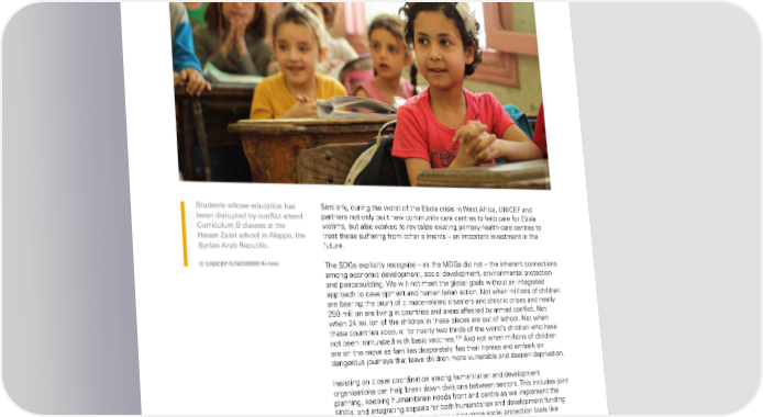 Students whose education has Similarly, during the worst of the ebola crisis in West africa, UniCef and been disrupted by conflict attend partners not only built new community care centres to help care for ebola Curriculum B classes at the victims, but also worked to revitalize existing primary-health-care centres to Hasan Zaiat school in Aleppo, the treat those suffering from other ailments – an important investment in the Syrian Arab Republic. future. © UNICEF/UN018888/Al-Issa The SdGs explicitly recognize – as the MdGs did not – the inherent connections among economic development, social development, environmental protection and peacebuilding. We will not meet the global goals without an integrated approach to development and humanitarian action. not when millions of children are bearing the brunt of climate-related disasters and chronic crises and nearly 250 million are living in countries and areas affected by armed conflict. not when 24 million of the children in these places are out of school. not when these countries account for nearly two thirds of the world’s children who have 279 not been immunized with basic vaccines. and not when millions of children are on the move as families desperately flee their homes and embark on dangerous journeys that leave children more vulnerable and deepen deprivation. insisting on closer coordination among humanitarian and development organizations can help break down divisions between sectors. This includes joint planning, keeping humanitarian needs front and centre as we implement the SdGs, and integrating appeals for both humanitarian and development funding during specific crises. and it includes using more social protection tools like cash transfers in humanitarian emergencies to provide short-term support for families while strengthening social safety nets for the future. Taken together, these practical, cost-effective measures, focusing on countries in crisis, will not only support emergency response in the short term but also map out a path to expanded opportunity for the most vulnerable and excluded children throughout their lives. The STaTe of The World’S Children 2016 93
