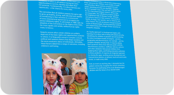 BOx 1. EqUITY DEFINED The term ‘equity’ may mean different things in different Society’s institutions play a critical role in determining contexts, but when UNICEF uses it, in this report and these outcomes for children, most notably in health elsewhere, it refers to all children having the same and education. Where policies, programmes and opportunities to survive, develop and attain their public spending priorities are equitable, targeting full potential. Fundamentally, it is about fairness and those in greatest need, they can lead to good results opportunity – a fair chance for every child. for the most disadvantaged children. Where they are inequitable, they effectively preselect children The conviction that all children possess the same right for heightened risks of disease, hunger, illiteracy to grow up healthy, strong, well-educated and capable and poverty based on their country, community or of contributing to their societies is a cornerstone family of origin, their gender, race or ethnicity and of every international agreement to recognize and other factors. This can perpetuate intergenerational protect children’s rights. It culminated, in 1989, with the cycles of disadvantage, harming individual children adoption of the Convention on the Rights of the Child, and undermining the strength of their societies as the most rapidly and widely ratified human rights inequality deepens. treaty in history. An ‘equity approach’ to development begins with Inequity occurs when certain children are unfairly learning more about who is being left behind and why, deprived of the basic rights and opportunities available identifying the children at greatest risk and analysing to others. It is frequently rooted in complex cultural, the structural determinants of inequity – poverty, political and systemic factors that shape societies and geography and discrimination, for example – and the the socio-economic status of individuals. Ultimately, complex interplay among them. It requires asking these factors determine a range of outcomes, including hard questions about how deficient public policies, children’s well-being. discriminatory practices, inefficient delivery systems and other obstacles that prevent children from realizing their rights, and finding innovative solutions to these problems. It requires an integrated approach to closing the gaps, working across development and humanitarian sectors, at national, local and community levels, to reach every child. And, as much as anything else, it demands that the global community recognize the critical connection between the well-being of the most disadvantaged children and the future of our shared world. Children attend a remedial class, held inside a building sheltering displaced families in Homs, in the Syrian Arab Republic. © UNICEF/UNI137681/Morooka The STaTe of The World’S Children 2016 7