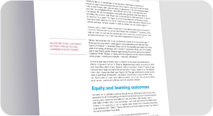 Education: Levelling the playing field >> Equity and learning outcomes There are multiple reasons for disadvantage in education. in China, for example, migration from rural districts to urban centres affects whether children have 134 access to education entitlements. if they are living in cities but remain registered in rural areas, their entitlements may be severely limited. Poverty is also an important part of the equation. The impact of poverty on education begins early, because the poorest children in any country are the least likely to attend early childhood education programmes.135 and the disadvantages continue. in sub-Saharan africa, nearly 60 per cent of 20- to 24-year-olds from the poorest fifth of the population have been through fewer than four years of schooling. By contrast, only 15 per cent in the richest quintile have been in school 136 for less than four years. in egypt and the United republic of Tanzania, being born poor nearly doubles the risk of missing out on basic education relative to the 137 national average. for poor women in both countries, the risk is even higher. in recent years, wealth-based disparities in attendance rates have narrowed in many countries as primary school attendance has increased.138 however, while children from the poorest households are now more likely to enter school, they are also more likely than their more advantaged peers to drop out.139 140 Pakistan has more than 5.6 million out-of-school children of primary school age. edUCaTion iS noT JUST aBoUT There are also large wealth-related gaps in school attendance and retention (see GeTTinG ThroUGh SChool; Figure 2.4). Children in the richest 20 per cent of the population get nearly nine more years of schooling, on average, than children in the poorest 20 per cent. This wealth learninG iS WhaT CoUnTS. gap is magnified by gender disadvantages among the poorest girls and by regional disparities. While Pakistan is making national progress in primary school completion, some groups – notably poor rural girls – have been left behind.141 education pathway analysis helps to identify when disparities intensify as children progress in school. in nigeria, disparities begin early. according to 2013 data, less than a third of poor nigerian children between 15 and 17 years of age had entered primary school at the correct time, though nearly all of the children from richer households had (see Figure 2.5). The gap continues to widen at the start of each level of education, as greater proportions of poor children drop out. By the start of upper secondary education, only 7 per cent of poor children enter school, compared to 80 per cent of wealthier children. Equity and learning outcomes education is not just about getting through school; learning is what counts. But assessments of the knowledge and skills that children acquire in school indicate that education systems have failed millions of children. Worldwide, nearly 250 million children of primary school age – well over one third of the 650 million children in this age group – do not master basic literacy and numeracy, according to an estimate from 2013.142 Some 130 million of them spend at least four years in school and still lack these skills. learning deficits begin early, sometimes even before primary school. in 28 countries or areas with available data, less than half of children between the ages 143 of 3 and nearly 5 were developmentally on track in literacy and numeracy in 2014. The lack of learning in children’s early years raises concerns at many levels. in early childhood and primary school, children acquire the foundational skills that allow them to develop problem-solving capabilities, flourish in secondary education and later succeed in employment markets. The STaTe of The World’S Children 2016 46