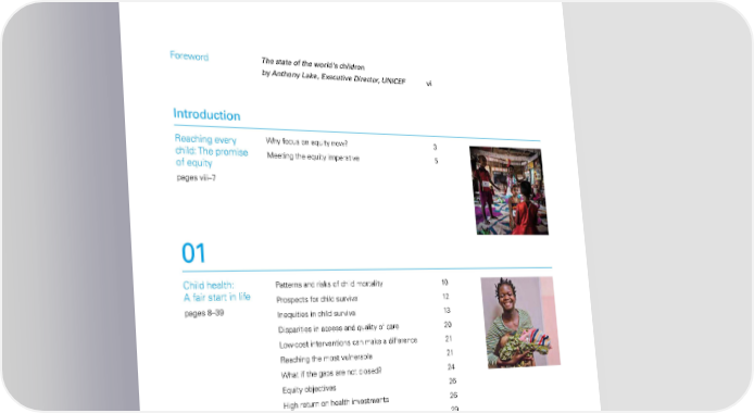 Contents foreword The state of the world's children by Anthony Lake , Executive Director, UNICEF vi Introduction reaching every Why focus on equity now? 3 child: The promise Meeting the equity imperative 5 of equity pages viii–7 01 Child health: Patterns and risks of child mortality 10 a fair start in life Prospects for child survival 12 pages 8–39 inequities in child survival 13 disparities in access and quality of care 20 low-cost interventions can make a difference 21 reaching the most vulnerable 21 What if the gaps are not closed? 24 equity objectives 26 high return on health investments 26 Benefits of universal health coverage 29 adequate and equitable financing 34 Power in partnerships 37 The STaTe of The World’S Children 2016 ii