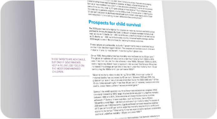 Child Health: A fair start in life >> Prospects for child survival 28 much as 38 per cent. Use of unimproved sanitation facilities and, specifically, the prevalence of open defecation are also implicated in stunting because they expose children to health problems that can interfere with normal growth. While progress on sanitation has been slow in many countries, there are encouraging indications that more rapid progress is possible. in nepal, a Social Movement for Sanitation has mobilized local communities and civic authorities in some of the poorest 29 parts of the country, creating 27 open defecation-free districts. Such initiatives have the potential to generate large returns for child survival. one evaluation in Mali found a 57 per cent reduction in diarrhoea-related deaths of children under age 5, and a 13 per 30 cent reduction in child stunting, in open defecation-free communities. Prospects for child survival The 2030 goals have set a high bar for progress on maternal, newborn and child survival and health. among the targets for Goal 3 is the aim to reduce neonatal mortality to at least as low as 12 deaths per 1,000 live births and under-five mortality to at least as low as 25 deaths per 1,000 live births in every country. Universal health coverage, another 2030 target, is one of the conditions for reaching the above outcomes. These targets are achievable, but only if governments keep a relentless focus on the most disadvantaged children. The deepest and earliest cuts in child and maternal mortality must benefit those facing the highest risks. 31 Since 1990, the global under-five mortality rate has been cut by 53 per cent. TheSe TarGeTS are aChieVaBle, The global annual rate of reduction in under-five mortality from 2000 to 2015 BUT onlY if GoVernMenTS was more than double the rate achieved in the 1990s. Between 2000 and 2015, KeeP a relenTleSS foCUS on every region registered major progress in child survival. Sub-Saharan africa has increased the average annual rate of decline in under-five mortality from 1.6 per The MoST diSadVanTaGed 32 cent during the 1990s to 4.1 per cent since 2000. Children. Maternal mortality rates are also falling. Since 1990, the annual number of maternal deaths has decreased by 43 per cent. Between 2005 and 2015, the 33 global annual rate of reduction was more than twice the 1990–2000 rate. of the 75 countries accounting for more than 95 per cent of maternal, newborn and child 34 deaths, about three quarters made accelerated gains. Some of the world’s poorest countries have made extraordinary progress. While the world missed the MdG target of a two-thirds reduction in under-five mortality between 1990 and 2015, 24 low-income and lower-middle-income countries 35 achieved it. Some of these countries – such as ethiopia, liberia, Malawi, 36 Mozambique and niger – started out with very high mortality rates, in excess of 200 deaths per 1,000 live births. egypt and Yemen achieved respective declines of 72 per cent and 67 per cent in under-five mortality despite chronic conflict and 37 economic hardships. Meanwhile, China has experienced a rapid and considerable 38 decline in under-five mortality – 80 per cent since 1990. The diversity of national experiences demonstrates that dramatic reductions in child mortality are possible in countries whose social, political and economic contexts vary widely. The same is true for maternal health, given that a range of countries with different contexts and starting points achieved the MdG target of a 75 per cent reduction in maternal mortality. While child mortality generally declines as average income increases, many poorer countries are outpacing richer neighbours in reducing their under-five mortality rates (see Figure 1.1). Yet some countries in the fast lane for global economic growth The STaTe of The World’S Children 2016 12