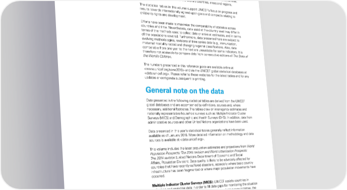 Overview This reference guide presents the most recent key statistics on child survival, development and protection for the world’s countries, areas and regions. The statistical tables in this volume support UNICEF’s focus on progress and results towards internationally agreed-upon goals and compacts relating to children’s rights and development. Efforts have been made to maximize the comparability of statistics across countries and time. Nevertheless, data used at the country level may differ in terms of the methods used to collect data or arrive at estimates, and in terms of the populations covered. Furthermore, data presented here are subject to evolving methodologies, revisions of time series data (e.g., immunization, maternal mortality ratios) and changing regional classifications. Also, data comparable from one year to the next are unavailable for some indicators. It is therefore not advisable to compare data from consecutive editions of The State of the World’s Children. The numbers presented in this reference guide are available online at and via the UNICEF global statistical databases at . Please refer to these websites for the latest tables and for any updates or corrigenda subsequent to printing. General note on the data Data presented in the following statistical tables are derived from the UNICEF global databases and are accompanied by definitions, sources and, where necessary, additional footnotes. The tables draw on inter-agency estimates and nationally representative household surveys such as Multiple Indicator Cluster Surveys (MICS) and Demographic and Health Surveys (DHS). In addition, data from administrative sources and other United Nations organizations have been used. Data presented in this year’s statistical tables generally reflect information available as of January 2016. More detailed information on methodology and data sources is available at . This volume includes the latest population estimates and projections from World Population Prospects: The 2015 revision and World Urbanization Prospects: The 2014 revision (United Nations Department of Economic and Social Affairs, Population Division). Data quality is likely to be adversely affected for countries that have recently suffered disasters, especially where basic country infrastructure has been fragmented or where major population movements have occurred. Multiple Indicator Cluster Surveys (MICS): UNICEF assists countries in collecting and analyzing data in order to fill data gaps for monitoring the situation of children and women through its international household survey initiative, the Multiple Indicator Cluster Surveys (MICS). Since 1995, over 280 surveys have been completed in more than 100 countries and areas. MICS are among the largest sources of data for monitoring progress towards internationally agreed-upon development goals for children, including the MDGs. More information is available at . 108 THE STATE OF THE WORLD’S CHILDREN 2016