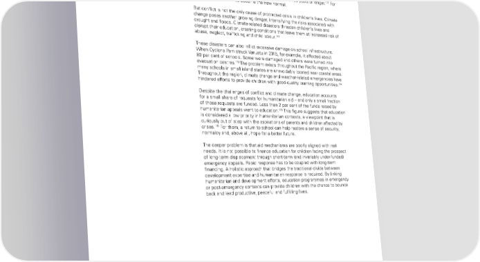 Education: Levelling the playing field >> Education in emergencies and protracted crises Conflict that drives children and families from their homes often leads to a state of persistent displacement. at the end of 2014, half of all refugees had been in exile for more than 10 years, and at least half of internally displaced 171 people had a high probability of being uprooted for three years or longer. for them, displacement has become the new normal. But conflict is not the only cause of protracted crisis in children’s lives. Climate change poses another growing danger, intensifying the risks associated with drought and floods. Climate-related disasters threaten children’s lives and disrupt their education, creating conditions that leave them at increased risk of 172 abuse, neglect, trafficking and child labour. These disasters can also inflict extensive damage on school infrastructure. When Cyclone Pam struck Vanuatu in 2015, for example, it affected about 80 per cent of schools. Some were damaged and others were turned into evacuation centres.173 The problem exists throughout the Pacific region, where many schools in small island states are unavoidably located near coastal areas. Throughout the region, climate change and weather-related emergencies have hindered efforts to provide children with good-quality learning opportunities.174 despite the challenges of conflict and climate change, education accounts for a small share of requests for humanitarian aid – and only a small fraction of those requests are funded. less than 2 per cent of the funds raised by 175 humanitarian appeals went to education. This figure suggests that education is considered a low priority in humanitarian contexts, a viewpoint that is curiously out of step with the aspirations of parents and children affected by 176 crises. for them, a return to school can help restore a sense of security, normalcy and, above all, hope for a better future. The deeper problem is that aid mechanisms are poorly aligned with real needs. it is not possible to finance education for children facing the prospect of long-term displacement through short-term (and invariably under-funded) emergency appeals. rapid response has to be coupled with long-term financing. a holistic approach that bridges the traditional divide between development expertise and humanitarian response is required. By linking humanitarian and development efforts, education programmes in emergency or post-emergency contexts can provide children with the chance to bounce back and lead productive, peaceful and fulfilling lives. The STaTe of The World’S Children 2016 54