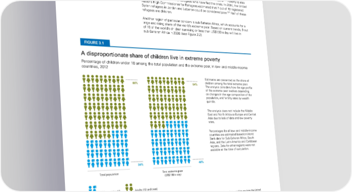 in the Syrian arab republic, data suggest the conflict that began there in 2011 caused a sharp increase in the rate of extreme poverty, measured by the proportion of the population living below a national poverty line. The rate increased 226 from 12.3 per cent in 2007 to an estimated 43 per cent in 2013. Poverty is also a concern for the millions of refugees who have fled the crisis. in 2014, the United nations high Commissioner for refugees estimated that 7 out of 10 registered 227 Syrian refugees in Jordan and lebanon could be considered poor. half of these refugees are children. another region of particular concern is sub-Saharan africa, which accounts for a large and rising share of the world’s extreme poor. Based on current trends, 9 out of 10 of the world’s children surviving on less than US$1.90 a day will live in sub-Saharan africa in 2030 (see Figure 3.2). FIGURE 3.1 A disproportionate share of children live in extreme poverty Percentage of children under 18 among the total population and the extreme poor, in low- and middle-income countries, 2012 estimates are presented as the share of 66% 54% children among the total extreme poor. The analysis considers how the age profile of the extreme poor evolves depending on changes in the age composition of the population, and fertility rates by wealth quintile. The analysis does not include the Middle east and north africa or europe and Central asia due to lack of data and low poverty rates. Percentages for all low- and middle-income countries are estimated based on World Bank data for Sub-Saharan africa, South asia, and the latin america and Caribbean regions. data for other regions were not available at the time of calculation. 34% 46% Total population Total extreme poor (US$1.90 a day) Children under 18 adults (18 and over) Note: Poverty rates are derived from the World Bank’s Povcalnet and Global Monitoring Report 2015/2016. age-disaggregated population profiles are from the United nations department of economic and Social affairs 2012 estimates. fertility rates by wealth quintile are derived from demographic and health Surveys (after 2005). Child poverty estimates were calculated based on regional poverty aggregates and demographic factors, and not household income or consumption survey analysis. estimates for children using the updated international poverty line of US$1.90 a day are not yet available. however, the latest profile of the world’s extreme poor (based on the previous level of US$1.25 a day) revealed that 47 per cent of those living in extreme poverty were 18 years old or younger. Since the data used to calculate the first estimates relied on ranking profiles based on old surveys, the profile should provide a valid reference. Source: overseas development institute calculations for UniCef (2016), based on data from the World Bank (2016), and the United nations department of economic and Social affairs (2013) and dhS (after 2005). The STaTe of The World’S Children 2016 73