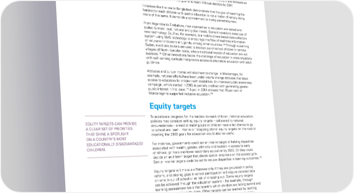 education for children in areas of high poverty and low school completion rates. Blending formal and non-formal methods to prepare students aged 8 to 14 for Grade 5 exams, the schools enrolled more than 790,000 children in 90 of the country’s poorest upazilas (sub-districts) between 2005 and 2012 and achieved an 192 83 per cent pass rate. The goal is to reach 148 sub-districts by 2017. initiatives like the one in Bangladesh demonstrate that the goal of reaching the hardest-to-reach children with quality education is not a matter of simply doing more of the same. it demands a commitment to trying something new. from argentina to Zimbabwe, new approaches to education are tested and scaled to meet local, national and global needs. Some innovations make use of new technology. eduTrac, for example, is a mobile phone-based data-collection system using SMS technology to encourage the flow of real-time information 193 on education indicators in Uganda, among other countries. Through elearning Sudan, electronic tablets are used to instruct out-of-school children in remote villages of north Kordofan state, where traditional modes of education are not 194 available. other innovations tackle the challenge of education in crisis situations with self-learning curricula that provide access to alternative education with adult guidance. attitudes and cultural norms will also have to change. in Montenegro, for example, national efforts have been under way to change attitudes that block access to education for children with disabilities. an intensive public awareness campaign, which started in 2010, is partially credited with generating greater 195 public interest in the issue. a poll in 2014 showed that 78 per cent of 196 Montenegrins supported inclusive education. Equity targets To accelerate progress for the hardest-to-reach children, national education eQUiTY TarGeTS Can ProVide policies may consider setting equity targets – calibrated to national a Clear SeT of PrioriTieS circumstances – aimed at making sure all children have a fair chance to go ThaT Shine a SPoTliGhT to school and learn. interim or ‘stepping stone’ equity targets on the road to meeting the 2030 goals for education would also be useful. on a CoUnTrY’S MoST edUCaTionallY diSadVanTaGed for instance, governments could set an interim target of halving disparities Children. associated with wealth, gender, ethnicity and location in access to early childhood, primary and lower secondary education by 2022. or they could decide on an interim target that places special emphasis on the poorest girls. 197 Similar interim targets could be set to reduce disparities in learning outcomes. equity targets will make a difference only if they are grounded in policy reform, and closing gaps in school participation will require detailed data on who is out of school or at risk of dropping out. Some equity targets can be achieved through the education system – for example, through learning assessment tools that identify which children are falling behind and guide resources towards them. other targets can be reached by tackling disadvantages associated with poverty, gender, ethnicity and disability. as a guide for policymakers, equity targets can provide a clear set of priorities that shine a spotlight on a country’s most educationally disadvantaged children. The STaTe of The World’S Children 2016 59